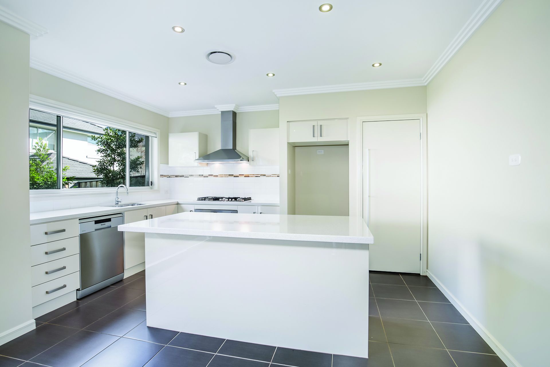 Ultra-modern gourmet kitchen with Caesar stone bench tops with an island bench, stainless steel appliances, dishwasher & gas cooking