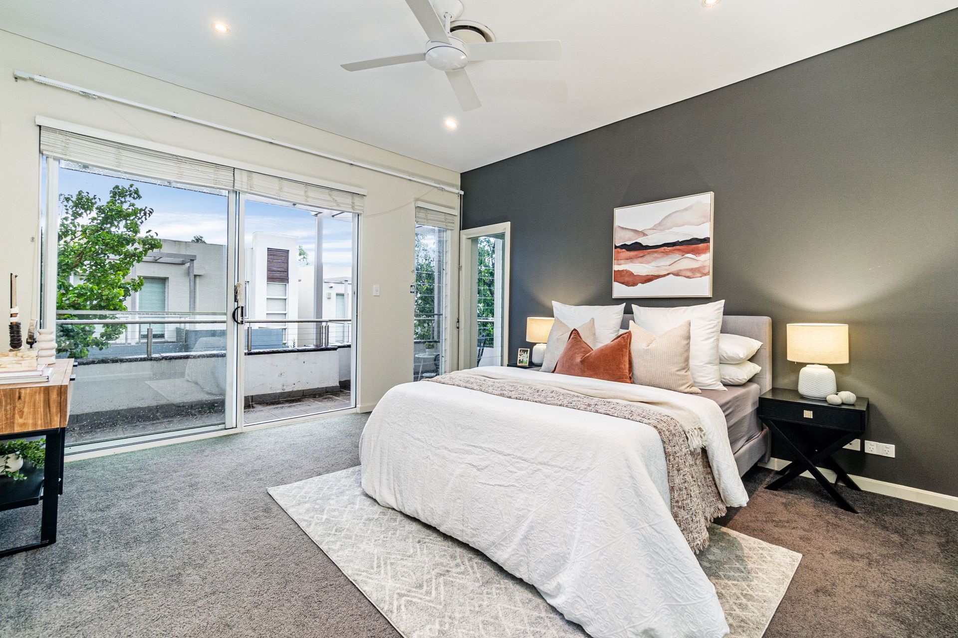 Master bedroom featuring an ensuite, walk-in robe, and access to a spacious private balcony